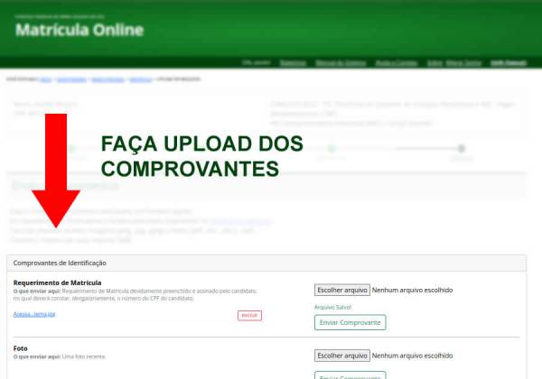 4) A quarta etapa é a de upload de comprovantes. Nessa etapa, o candidato deve submeter os documentos solicitados no edital do curso. Fique atento às orientações sobre tamanho de arquivo e tipos de arquivos aceitos.